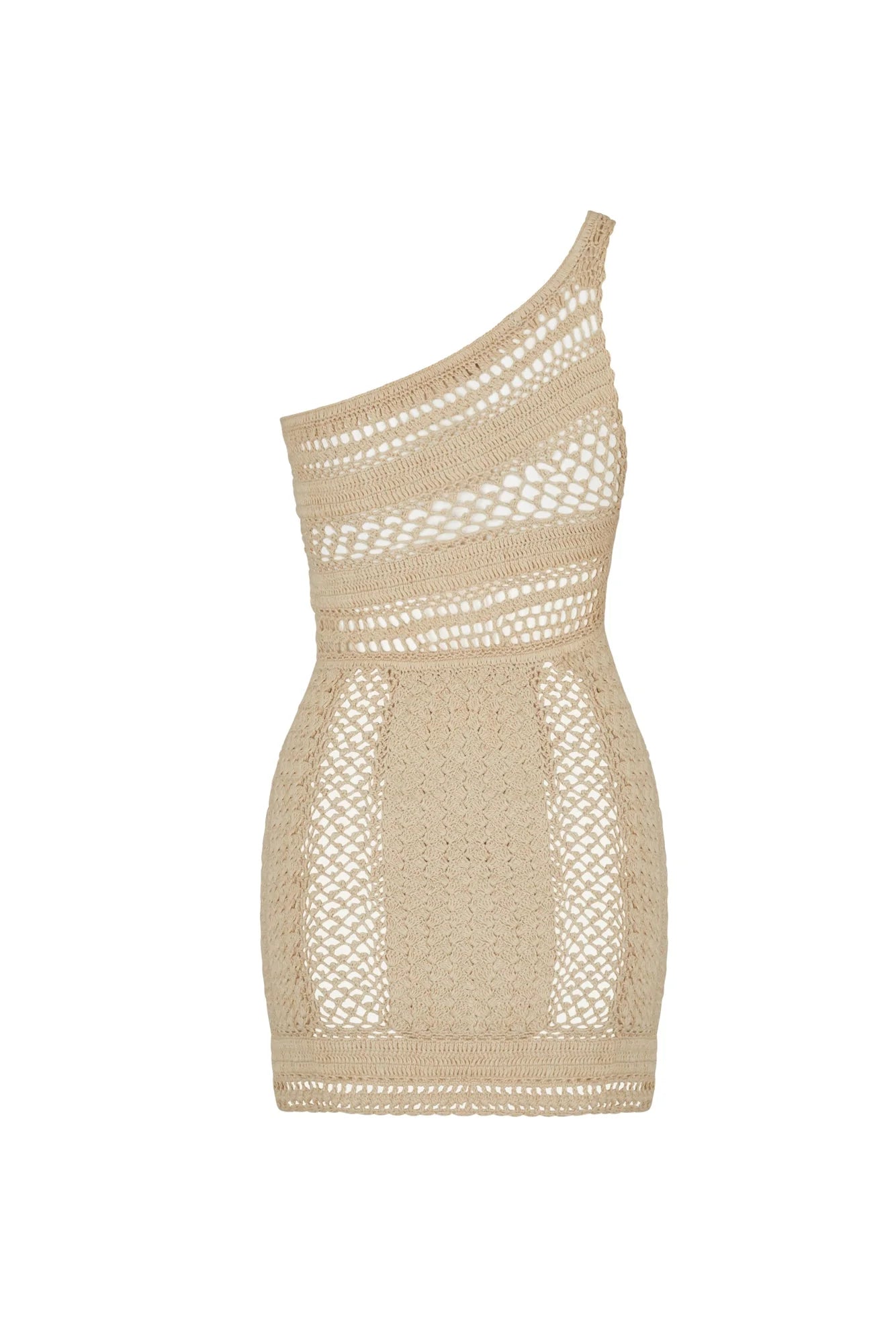 The Rune Dress features a mini-length and asymmetric neckline that is crafted from breathable cotton in Flook's signature crochet detail.