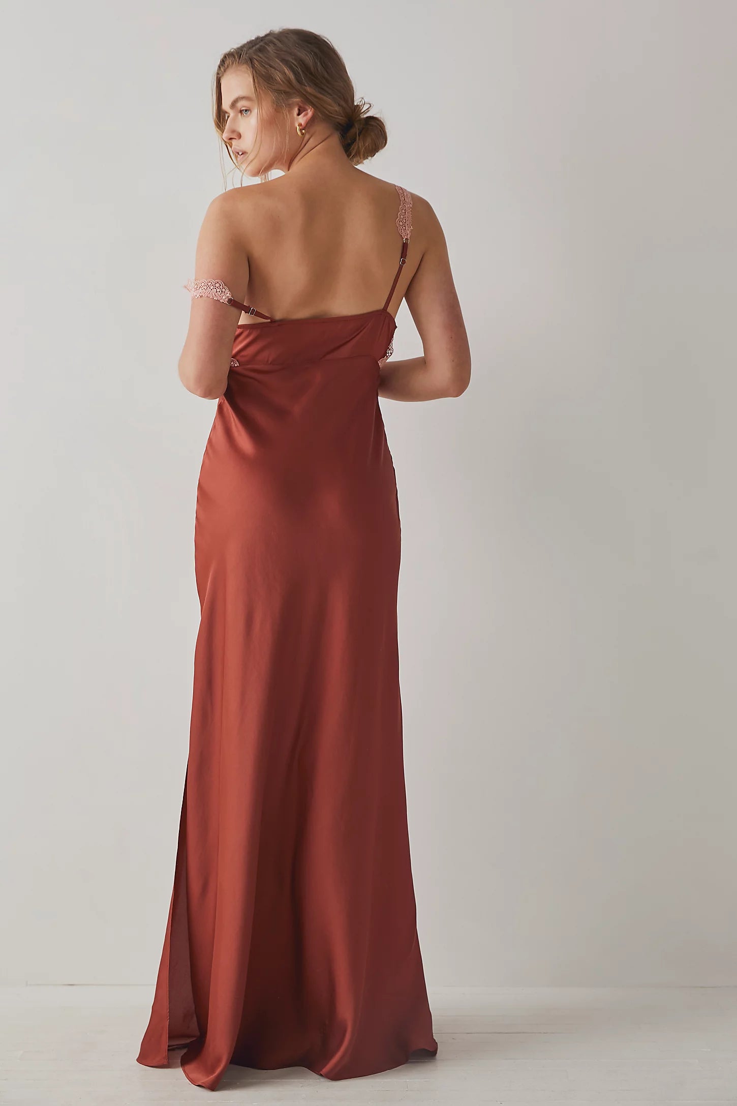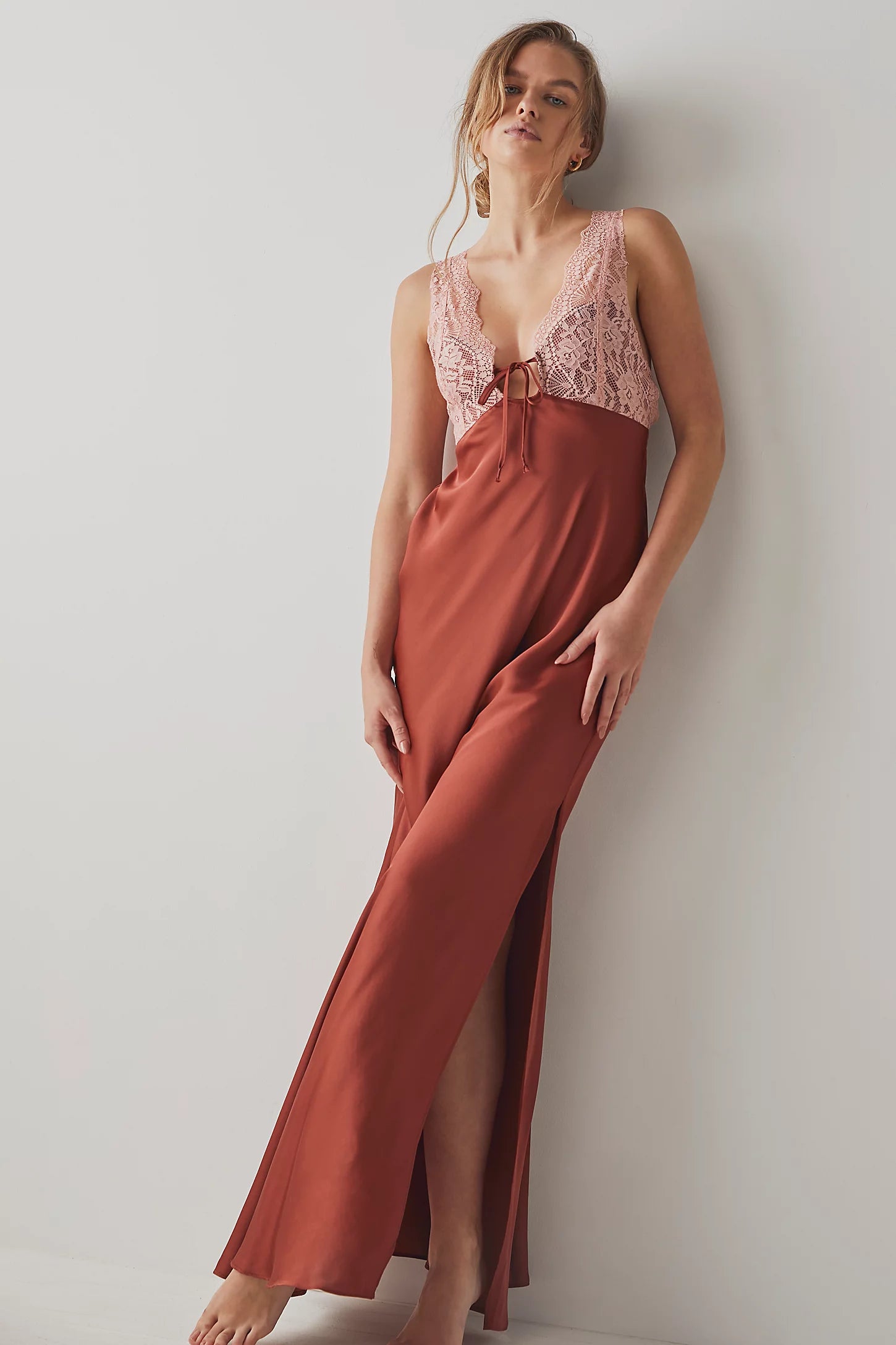 So sultry in a slinky fabrication, this maxi-length slip features luxe lace detailing at the bust and a bold slit at the leg. This slip can be layered underneath a chunky knit sweater or dressed up with your favourite heels for date night.